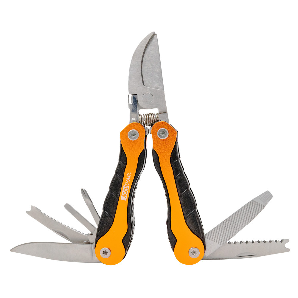 AccuSharp Sportsmans Multi-Tool, Orange and Black Handle, Includes Pruners, Phillips Screwdriver, Nail File, Large Screwdriver, Small Screwdriver, Saw, Sharp Knife, Fish Scaler, Hook Remover, 1-Inch Ruler, Nail/Staple Puller 085C